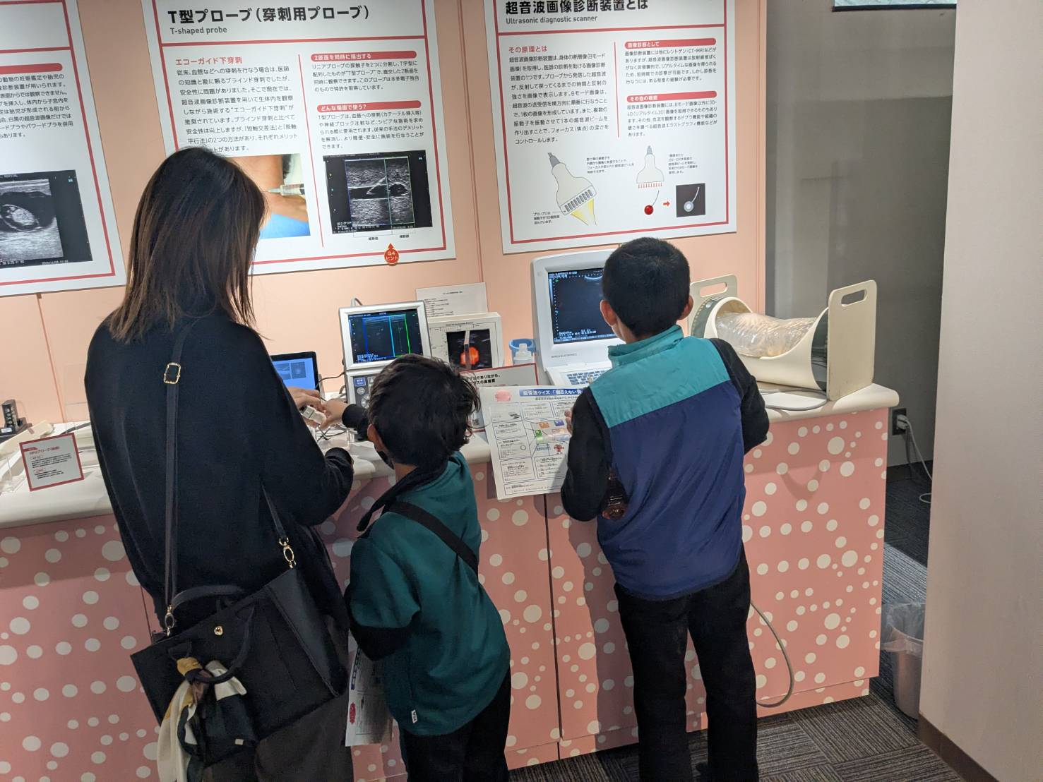 1秒間に4万回の振動で固いものも切断できる超音波カッターや、病院の診察で使われる医療診断装置(エコー)などを直接触って
